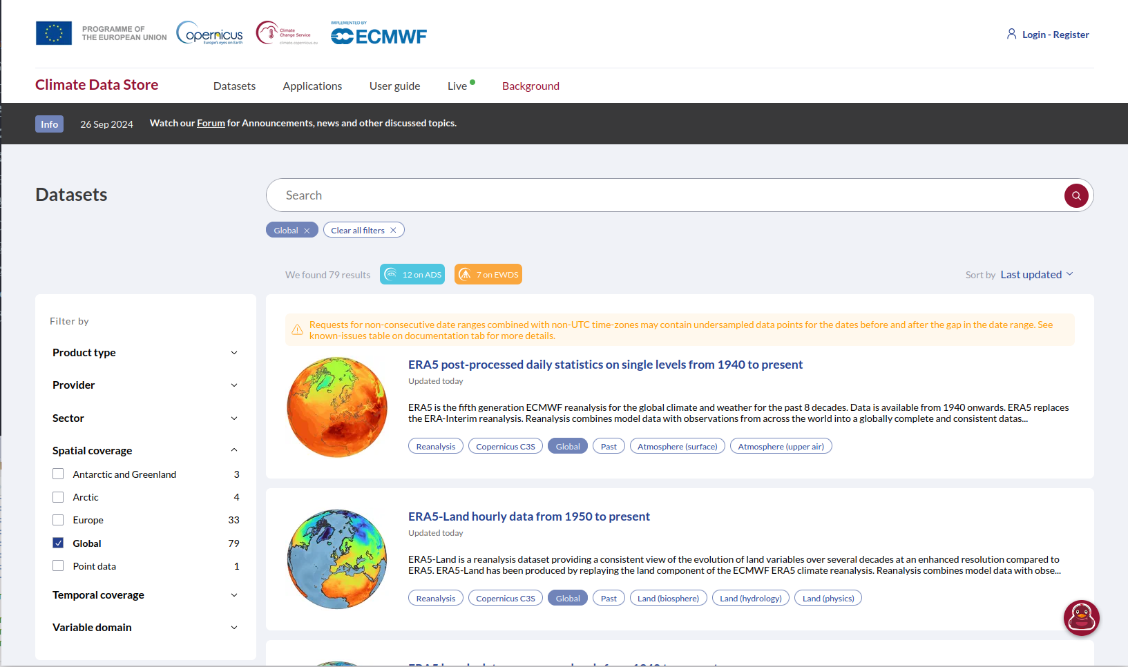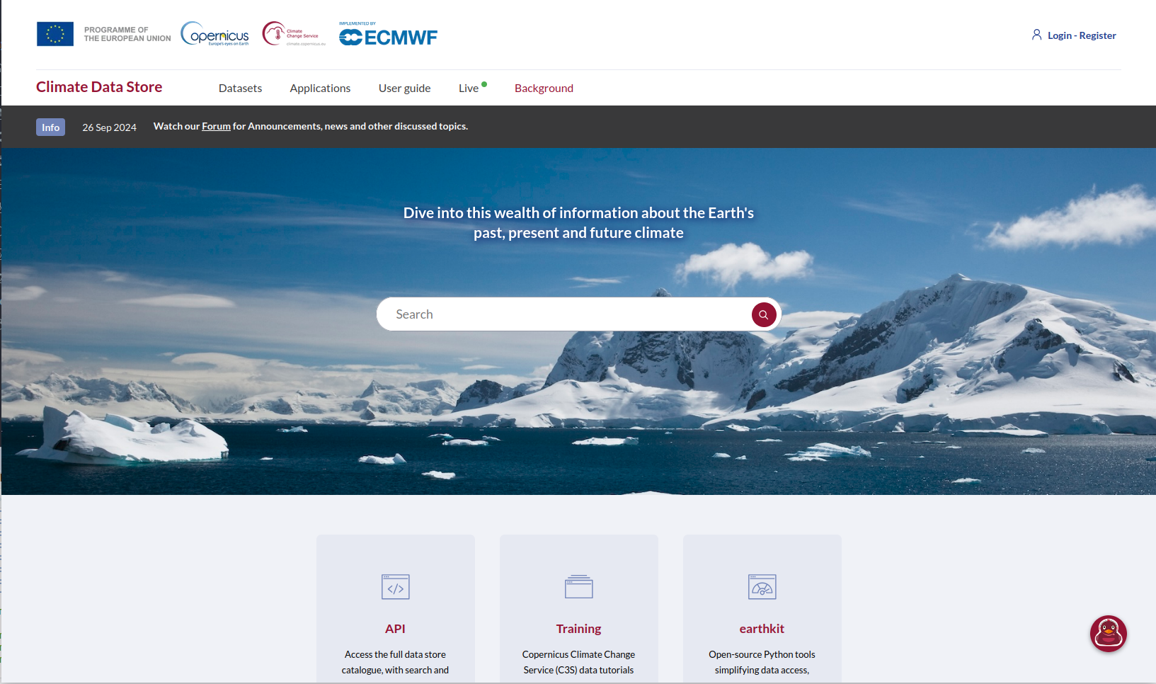 Users need to register or login to access many of the features on the climate Data Store (the login tab is found in the top right corner of the page). The CDS utilizes ECMWF user account which enables users to access the CDS as well as other ECMWF resources, events and courses. On CDS the user credentials are primarily used to track user activity, manage data access and ensure compliance with data licenses.