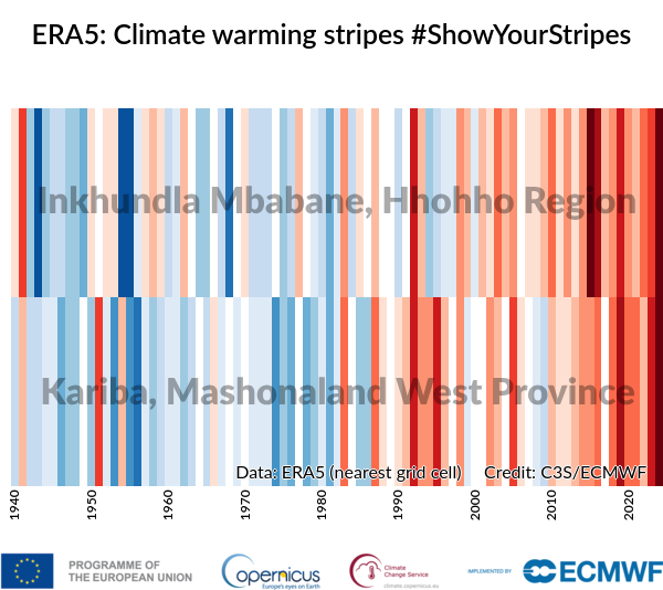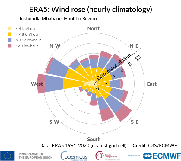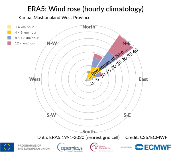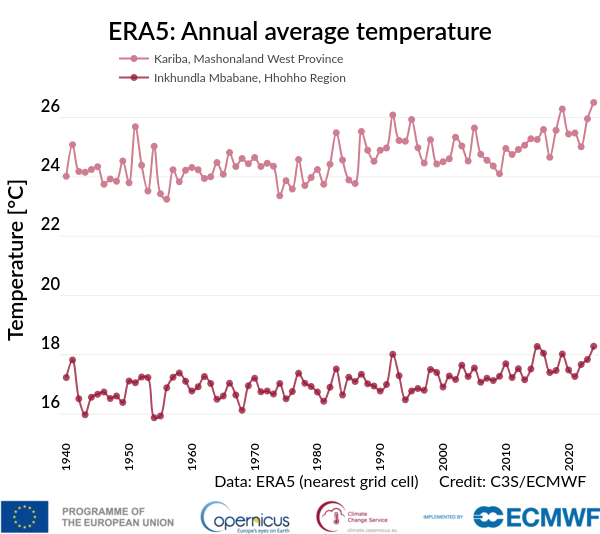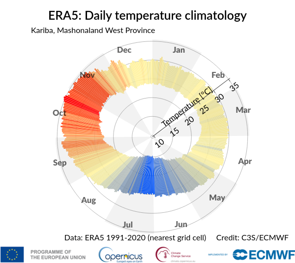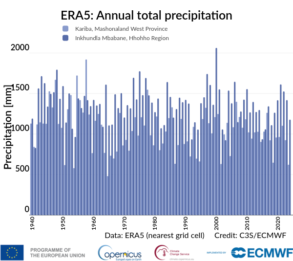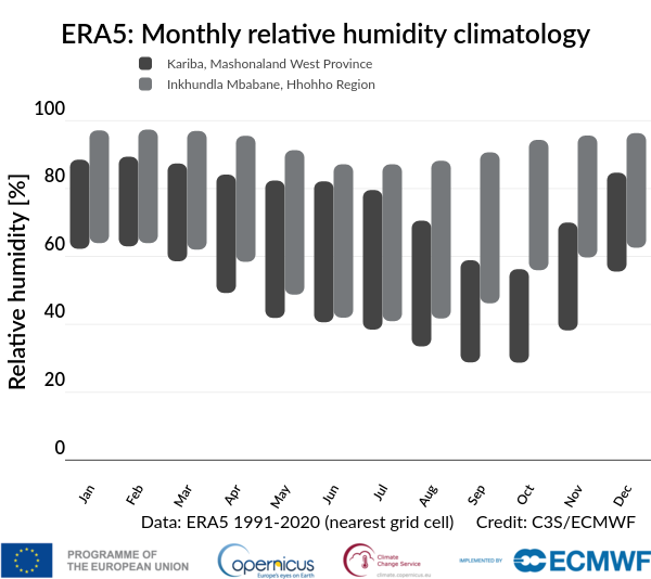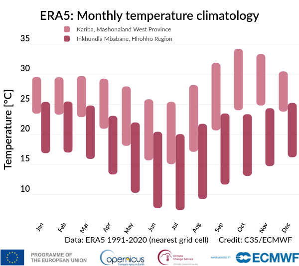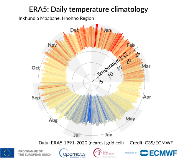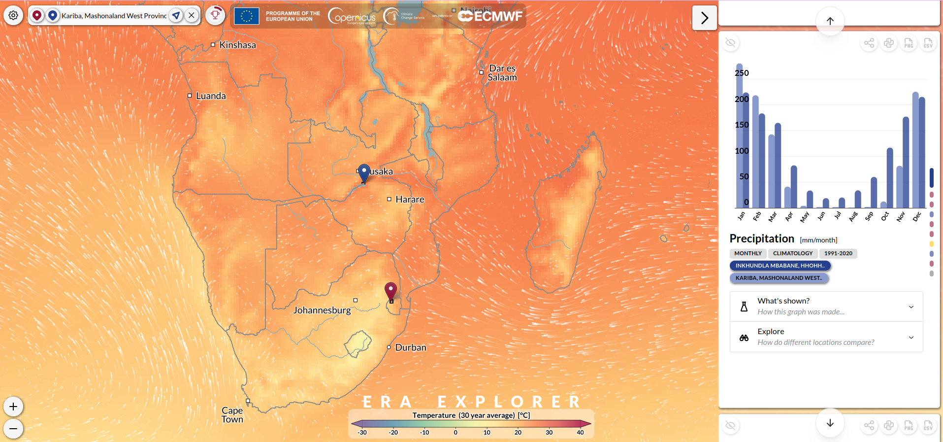 In this example, we demonstrate how to visualise ERA5 data using the ERA Explorer application provided by Climate Data Store (CDS). The ERA Explorer application allows users to explore the historical climate for anywhere on earth using the ERA5 reanalysis dataset and focuses on four key variables, temperature, rainfall, wind and humidity, all of which are important for Malaria modelling. In the below example we will focus on two different locations in southern Africa.