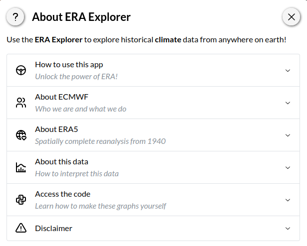 A guidance section, accessible via the “?” icon, provides information on how to use the app; the organisation, the ERA5 dataset and about the data, and how to interpret the plots presented in the app.