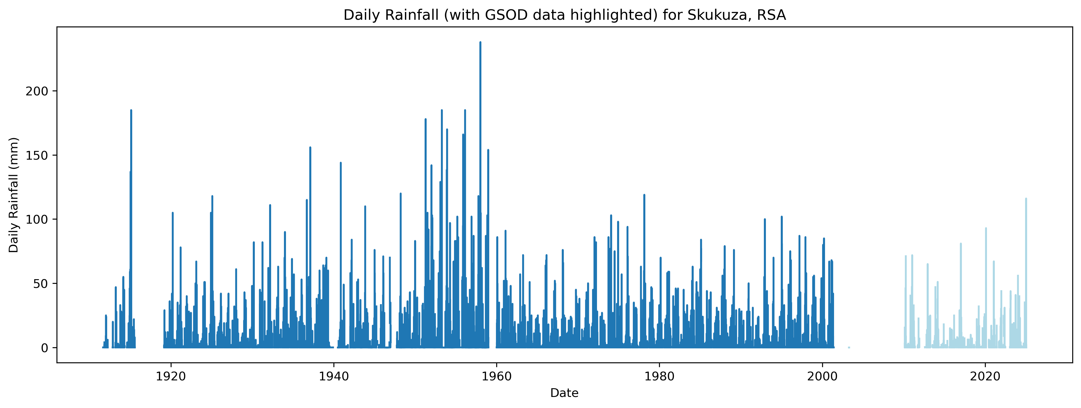 The GHCN Skukuza station rainfall record spans 1 September 1911 to 24 July 2025, with valid (non-missing) values available for 70.95% of the record. After 30 May 2001, the source of the data changes to the Global Summary of the Day (GSOD), meaning the values are derived from hourly synoptic reports exchanged via the Global Telecommunications System (GTS). GHCN cautions that “daily values derived in this fashion may differ significantly from ‘true’ daily data, particularly for precipitation (i.e., use with caution).” This change in source is highlighted in Figure 1.