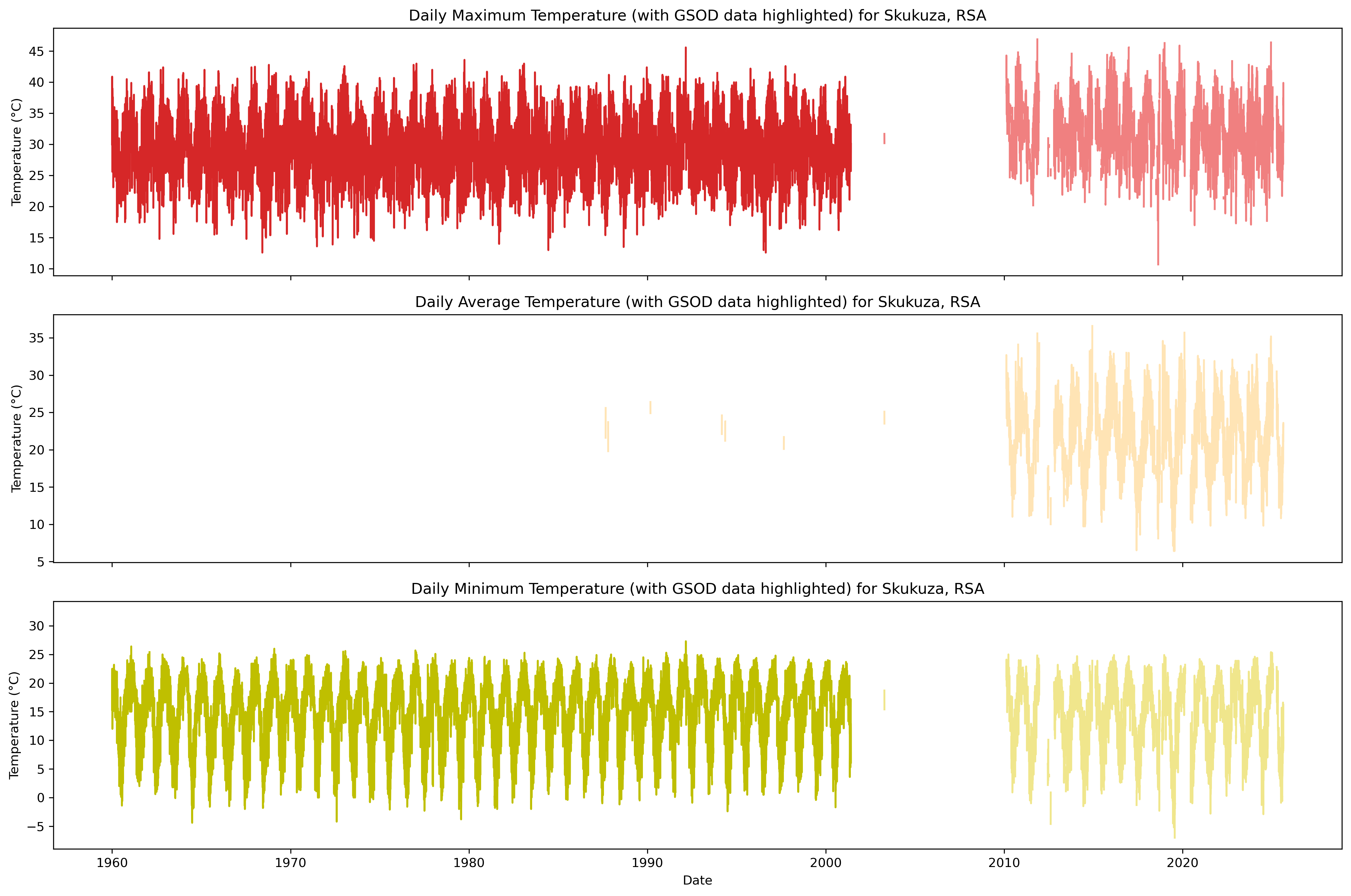 The GHCN Skukuza station has three temperature variables. Maximum and minimum temperatures are recorded from 1 January 1960 to 24 July 2025, with valid (non-missing) values available for around 80% of their records. As with the rainfall record, after 30 May 2001 the source of the data changes to the Global Summary of the Day (GSOD). All values for the average temperature variable are sourced from GSOD (Figure 2).