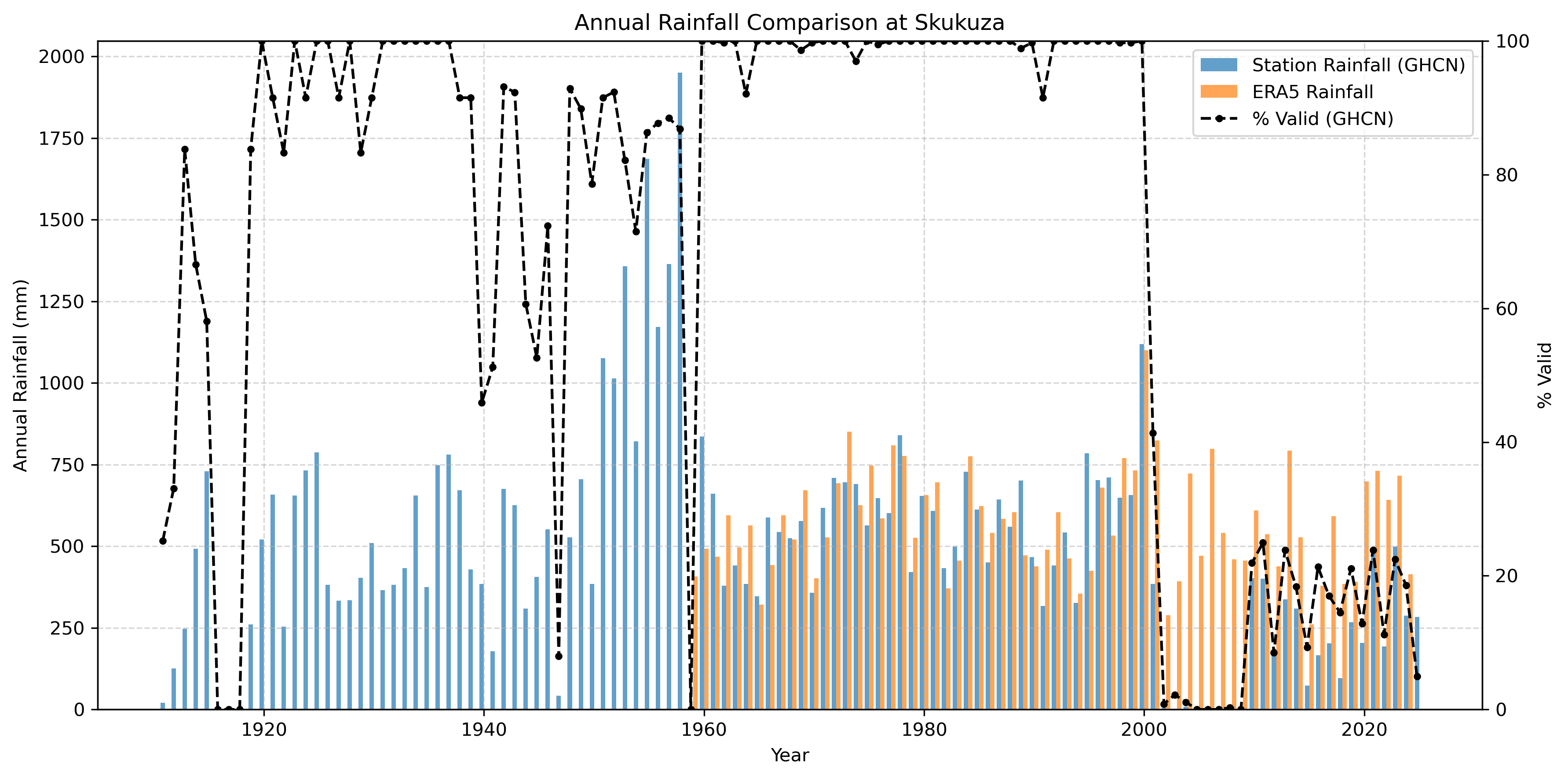 In Figure 3, we compare annual rainfall totals between the GHCN station record (blue bars) and the ERA5 grid cell (orange bars) over Skukuza. Annual rainfall provides a useful visual metric for assessing whether datasets capture comparable magnitudes of total rainfall. The percentage of valid (non-missing) daily values for the GHCN station is also shown in Figure 3 (black dots and line).
