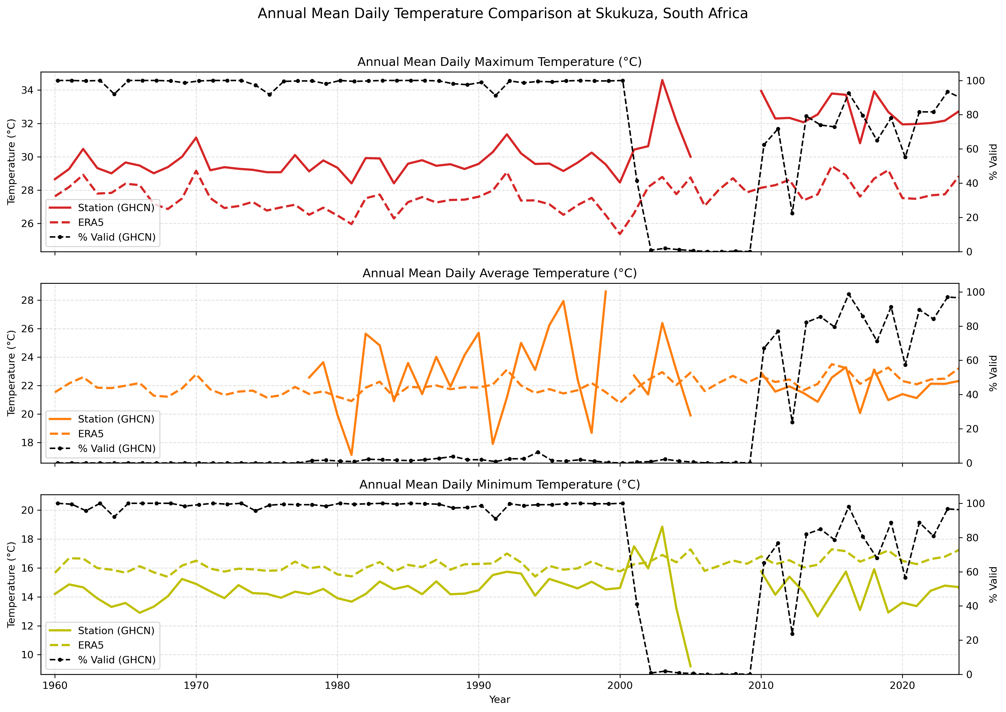 In this example, we use GHCN station data from Skukuza, South Africa. The station has a long record spanning 1911–2025 and includes precipitation and temperature variables. We will examine the sources of the data in the station record and discuss potential issues that users should be aware of. Finally, we compare the station data with ERA5 data for the grid cell containing Skukuza to explore any differences between the datasets.