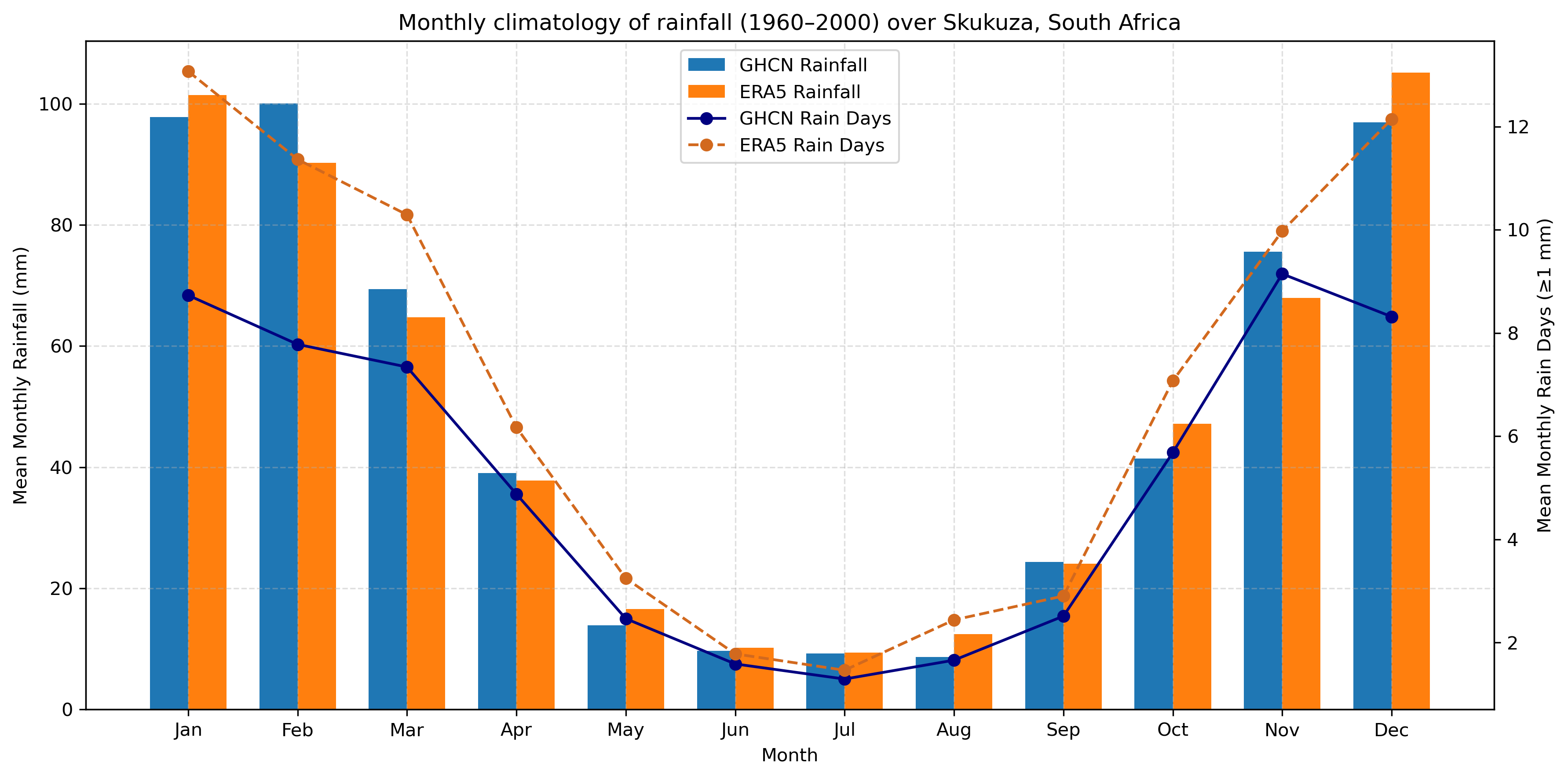 Figure 5 compares the monthly rainfall climatology from the GHCN station and the ERA5 reanalysis for Skukuza, averaged over 1960–2000. It shows two key metrics for each dataset: mean monthly rainfall and the mean number of rain days per month. Both datasets capture the strong seasonal rainfall cycle characteristic of the region, with a pronounced wet season during summer (November–March) and a dry season in winter (May–August). Although the timing of wet and dry seasons aligns between GHCN and ERA5, differences in rainfall magnitude and number of rain days show how station-based and gridded datasets can represent local climate differently. In particular, ERA5 consistently shows more rain days, with similar monthly average rainfall totals, suggesting it captures more low-intensity rainfall events than the GHCN station.