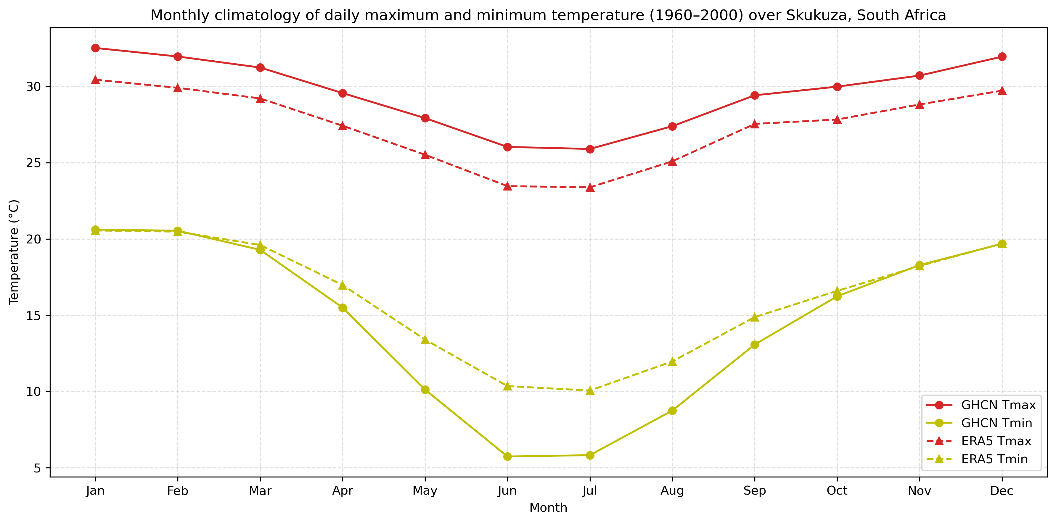Figure 6 compares the monthly climatologies of maximum and minimum temperatures between the GHCN station and the ERA5 grid cell at Skukuza, averaged over 1960–2000. The mean daily maximum temperature from ERA5 is consistently cooler than the station record across all months, suggesting a potential bias in the reanalysis. For minimum temperature, ERA5 is slightly warmer than the station during the winter/dry season months, but aligns closely with GHCN observations in summer/wet season.