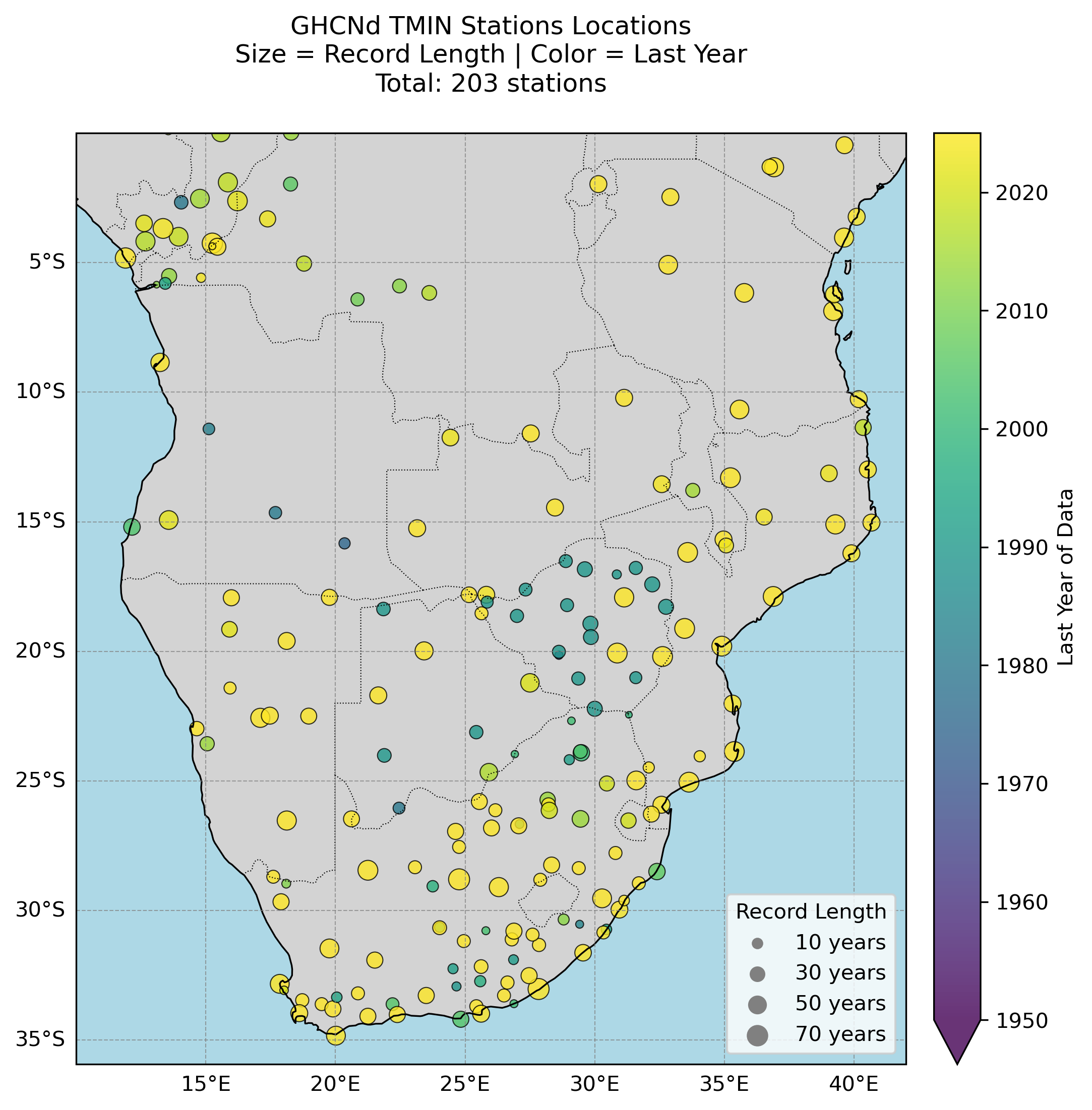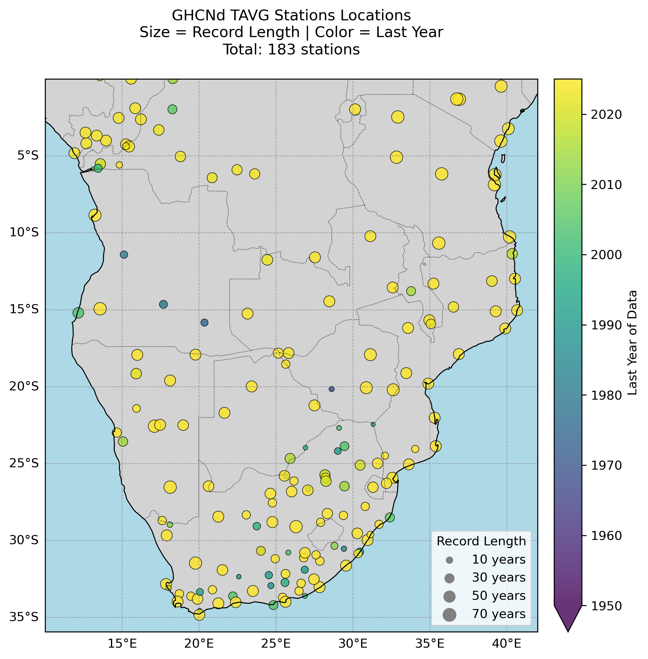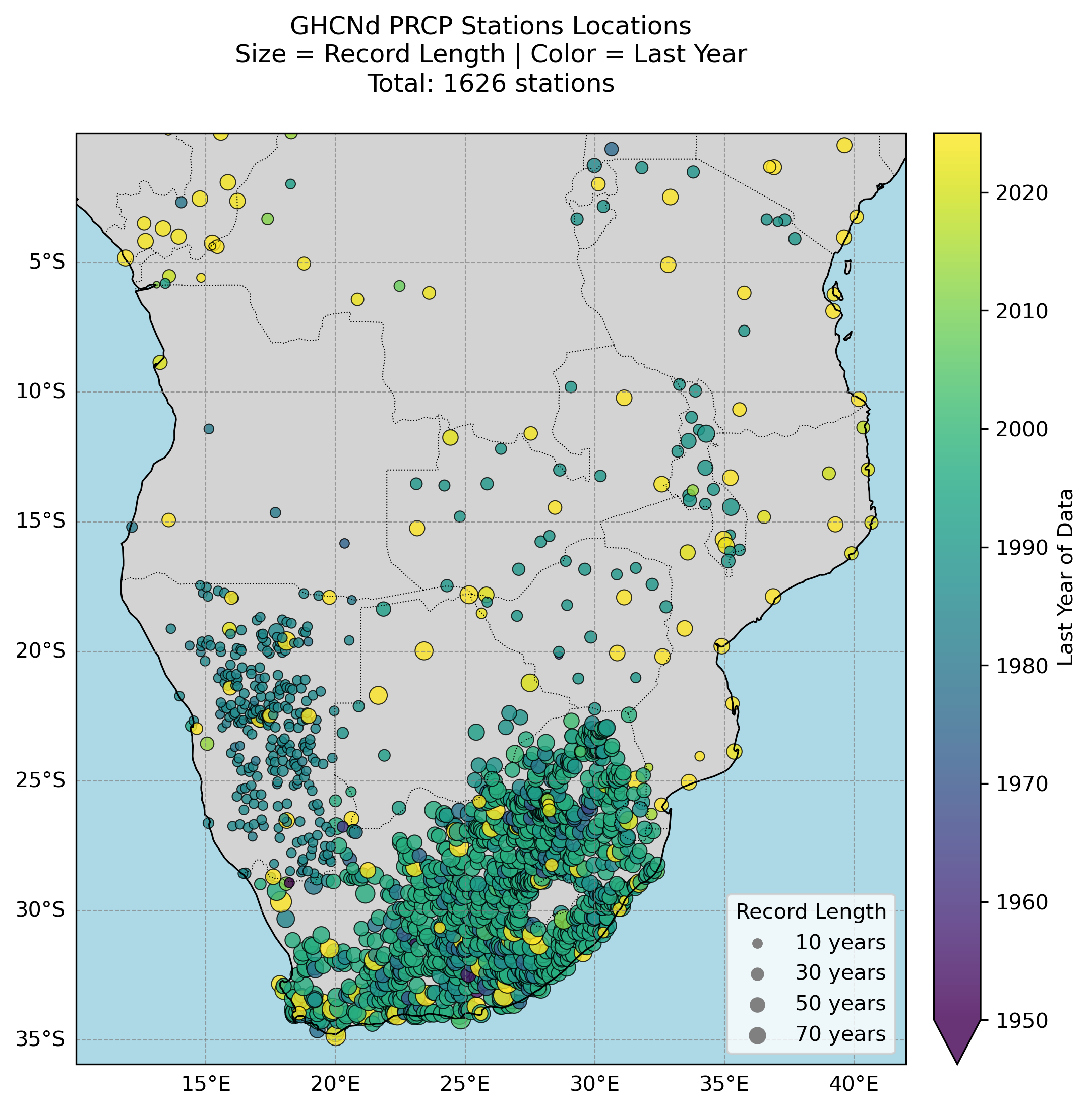 The GHCNd dataset consists of direct station observations rather than model outputs, presenting both unique advantages and analytical challenges. Unlike spatially complete gridded datasets, GHCNd exhibits uneven geographic coverage with particularly sparse station density across much of Africa outside urban centers and former colonial observation networks, while stations in temperate regions often benefit from longer and more complete records. Individual station histories frequently contain gaps due to operational interruptions, and many records are discontinuous as stations relocate or change instrumentation - a transition that may introduce artificial shifts in the data unless properly accounted for through metadata analysis. While NOAA applies rigorous quality control including outlier detection and homogenization algorithms to create climate-quality data, residual errors may persist at individual stations due to localized effects like urbanization or microclimate influences that aren’t fully corrected in the automated processing. These characteristics make GHCNd exceptionally valuable for validating gridded products and studying local climate extremes, but require careful preprocessing including gap-filling, homogeneity testing, and urban heat island screening when used for trend analysis or combined into regional composites. The dataset’s strength lies in its direct measurements of weather conditions, but this comes with the responsibility for users to thoroughly understand each station’s history and potential artifacts before drawing climate conclusions. Although the GHCNd dataset is updated daily, many African stations are updated irregularly and may rely on Global Summary of the Day (GSOD) feeds, with some historical records not extending to recent years, leading to delayed or incomplete data coverage compared with other regions.