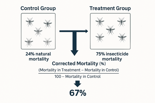 Measuring mortality among malaria vectors is often the endpoint of most vector assays and it is important that negative controls are done as part of the assay. If mortality is less than 5% then the results can be used without correction. If mortality is >5 ≤ 20%, the results need to be corrected to take into account mortality in the negative control. Abbott’s formula is a widely used correction method in entomology and bioassays. It helps researchers accurately assess the effectiveness of insecticides or treatments by accounting for natural mortality observed in control groups. This section summarizes the concept, mathematical expression, applications, and importance of Abbott’s formula, particularly in malaria vector studies.