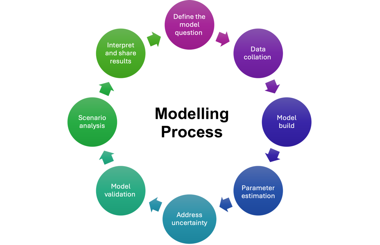 - Define the modelling question: It begins with defining a clear question that directly connects to a policy issue and can be answered using a model along with existing data and evidence.